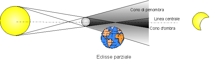 Quando il cono d’ombra manca completamente la Terra e solo quello di penombra riesce a colpirla si parla di eclisse parziale. Da nessun punto della Terra sarà possibile osservare la totalità o l’anularità dell’eclisse. Il cono di penombra stacca sulla superficie una ampia zona all’interno della quale si potrà osservare il Sole parzialmente coperto dalla Luna.