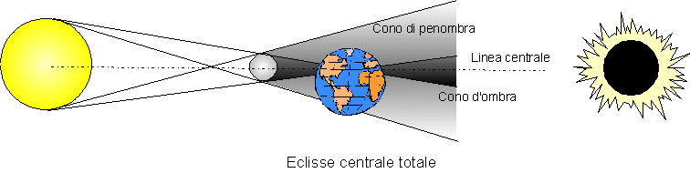 Nel primo caso il vertice del cono d’ombra non solo raggiunge la superficie del nostro pianeta ma addirittura vi sprofonda all’interno; il diametro apparente della Luna risulta maggiore di quello del Sole il quale risulta completamente coperto ed oscurato.