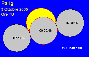 Diagramma dell'eclisse anulare del 3 Ottobre 2005 come vista rispettivamente da Parigi e da MadridLa linea orizzontale ideale passante per il centro del Sole è l'Eclittica. Poichè le posizioni della Luna sono relative, e non assolute, anche la traiettoria della Luna è da considerarsi di moto relativo rispetto al Sole; questo spiega perchè la sua inclinazione rispetto all'eclittica è spesso diversa dal valore angolare di 5° che corrisponde all'angolo che il piano dell'orbita lunare forma con l'Eclittica.