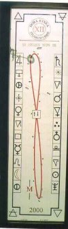 In questo caso sono stati riportati i simboli solo delle stagioni. La curva più bassa è quella relativa al segno del Cancro, cioè l'inizio dell'Estate (20-21 di Giugno); quella più in alto è relativa al 21 di Dicembre, giorno di inizio dell'Inverno e dell'ingresso del Sole nel segno del Capricorno. La curva intermedia, che in realtà è una linea rigorosamente retta, è relativa agli istanti degli Equinozi e quindi, indifferentemente può indicare sia il 21 di Marzo che il 23 di Settembre. Sono infatti riportati sia il simbolo dell'Ariete (a sinistra) che della Bilancia (a destra).