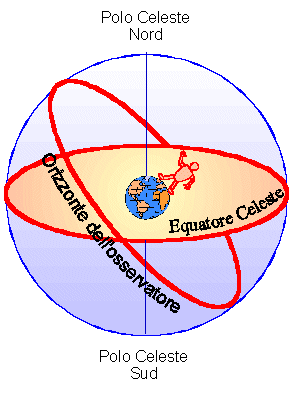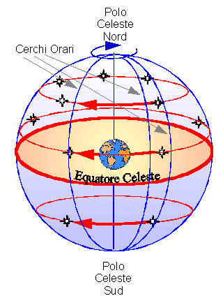 Tale rappresentazione prende il nome di Sfera Celeste. Su di essa si possono proiettare punti e cerchi di riferimento della Terra in modo tale che essa sia un modello espanso della Terra stessa. In particolare, e limitatamente a quanto ci interessa, sulla sfera sarà dunque presente un Equatore (Celeste), i Poli, i meridiani che, in questo caso, prendono il nome di Cerchi orari. ![]()
