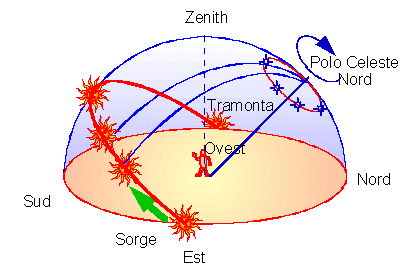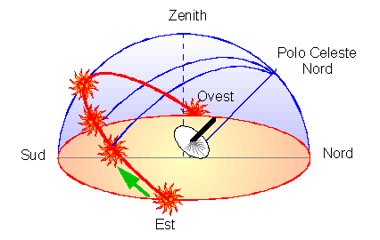 Per amor di precisione occorre aggiungere che il Sole, a causa del suo moto apparente annuo ( in realtà rivoluzione della Terra attorno ad esso) non sempre giace sull'Equatore Celeste (anzi non vi è quasi mai) ma si sposta un po' più a Nord ed un po' più a Sud (dando così origine al fenomeno delle stagioni). Il suo percorso sopra l'orizzonte sarà quindi diverso durante l'anno, a volte più lungo, altre più corto ma la sua velocità di rotazione (essendo comune a tutti gli astri, abbiamo detto, e indipendentemente dalla loro posizione) rimane quella di 15° all'ora.
