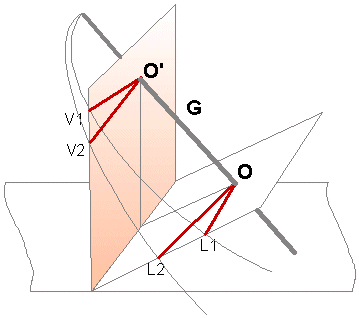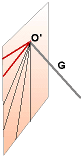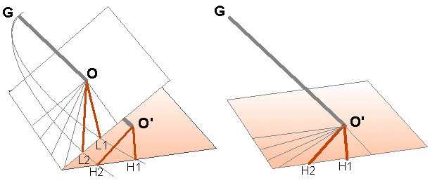 Considerando anche le intersezioni dei piani orari con una superficie orizzontale si ottengono le intersezioni O’-H1 e O’-H2 che sono le linee orarie di un quadrante orizzontale.