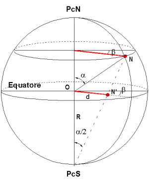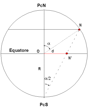 La proiezione di un punto, in vista prospettica ed in vista laterale L'arco PcN-N è visto dal centro della sfera sotto l'angolo alfa; per un principio geometrico lo stesso arco visto dal Polo Sud PcS è pari ad alfa/2.