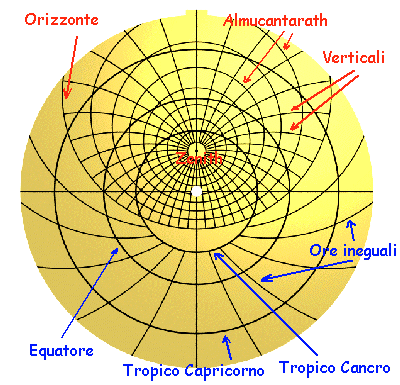 Il reticolo eccentrico che si vede in alto (la vera e propria tela di ragno, o aracne, termine con il quale spesso viene anche chiamata la lamina) rappresenta l’insieme dei cerchi verticali e dei cerchi di altezza (almucantarat) dell’osservatore. Il centro del cerchio più piccolo rappresenta lo zenith ed il cerchio più grande, interrotto quasi a metà, corrisponde all’orizzonte (pertanto non interamente rappresentato).
