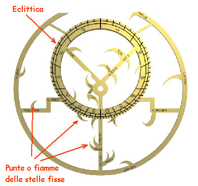 Il cerchio centrale ed eccentrico rappresenta l’eclittica; sul bordo esterno, dove sono riportate le graduazioni, si deve intendere la posizione che assume il Sole, durante l’anno, rispetto alle stelle fisse.