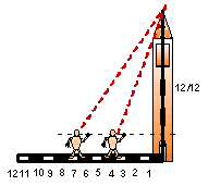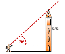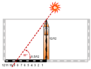 da cui H : 12 = Lo : 8.5Similmente si arriva, misurando, anzichè l’altezza del Sole e la lunghezza dell'ombra, l'elevazione orizzontale della sommità del campanile e la distanza del punto di osservazione. Ad es. se l’elevazione è 70° e la torre dista 40 passi si osserva che l’alidada segna il valore 5; ciò significa che la distanza è pari ai 5/12 dell’altezza e si potrà impostare la seguente proporzione H = 12 * Lo / 8.5 = 12 * 20 /8.5 = 28.3 passi