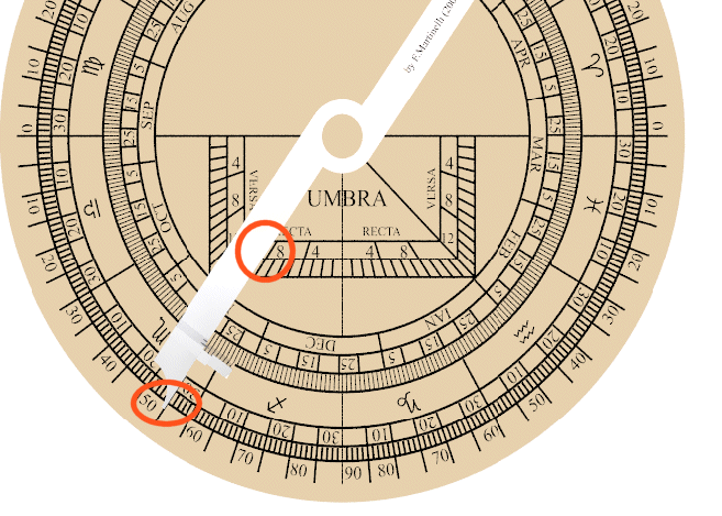 Con l'alidada si misura l'altezza istantanea del Sole e supponiamo risulti essere 55°. Senza muovere l'alidada si osservi la sua parte inferiore in corrispondenza del quadrato dell'umbra recta di sinistra, e si noti che indica un valore compreso tra 8 e 9, diciamo 8.5.