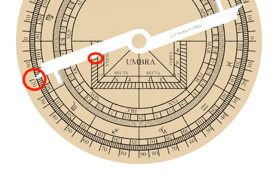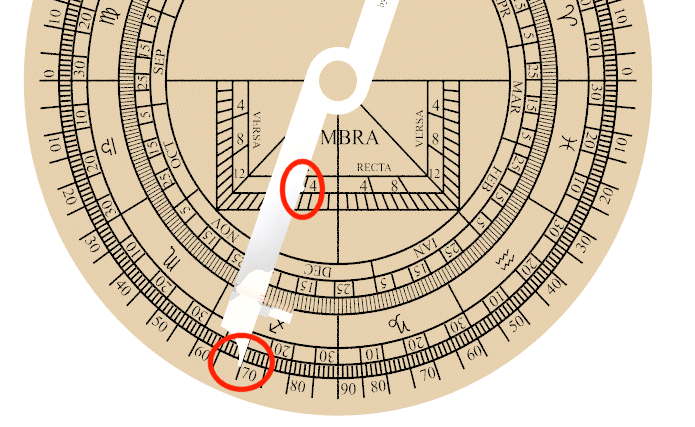 Sul dorso dello strumento, si ruoti l'alidada in modo da allineare il bordo interno dell'alidada (quello passante per il centro dell'astrolabio) sulla data di calendario; sulla scala zodiacale adiacente si leggano i gradi ed il segno.