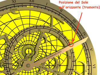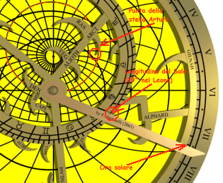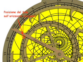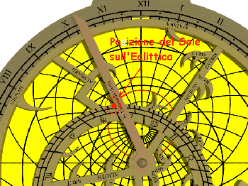 Sulla faccia anteriore dell'astrolabio ruotare l'indice in modo che segni sull'eclittica il valore in longitudine. Tale punto, sul bordo della rete, rappresenta la posizione del Sole sulla sfera celeste.