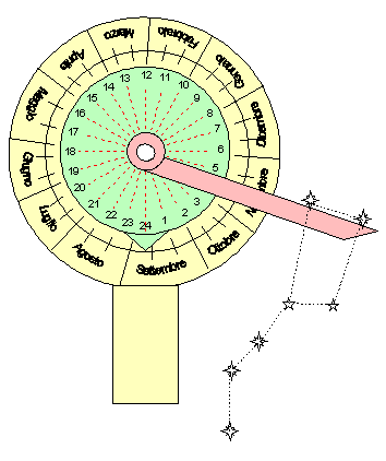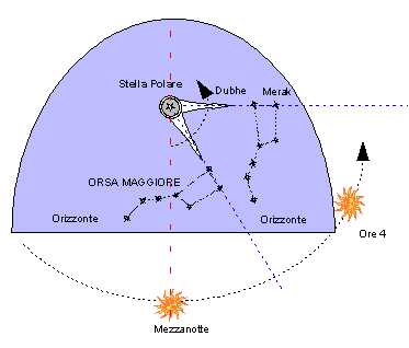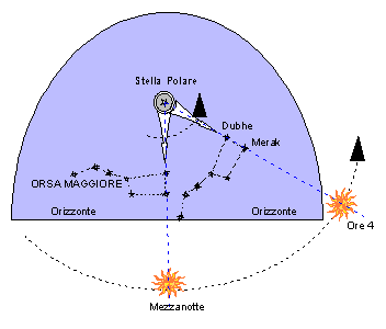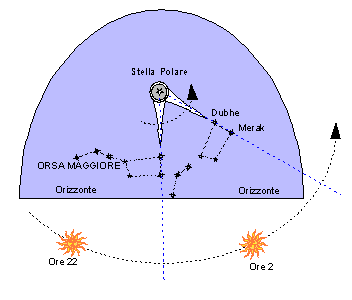 Se in particolare dedicassimo la nostra attenzione alla costellazione dell’Orsa Maggiore noteremmo che le due stelle cosiddette I Puntatori (Dubhe e Merak) essendo allineate permanentemente con la Stella Polare costituiscono una sorta di enorme lancetta di orologio astronomico che spazza il cielo a velocità costante, così come la lancetta delle ore di un normale orologio meccanico ne spazza il quadrante. Sarà sufficiente quindi associare la posizione di questa lancetta con un orario di riferimento per determinare l’ora in base al suo angolo di rotazione.