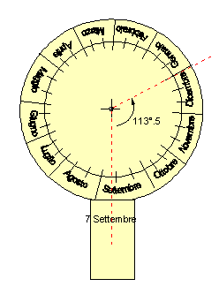 Questa parte costituirà la base dello strumento ed il riferimento calendariale sul quale tarare la lettura di un dato giorno. Sul bordo di questo disco andranno infatti segnati i giorni ed i mesi dell’anno. Poichè i giorni sono 365 ed il cerchio è ampio 360° per riportare le date, sotto forma di angolo rispetto ad una direzione di riferimento, occorre applicare la seguente espressione:gradi =giorni*360/365 Associata così la data di riferimento del 7 Settembre con la tacca sul manico, la data del 1.o Gennaio andrà riportata misurando un angolo dal centro pari a 113°.5 (115 giorni*360/365) in senso antiorario. Dal 1.o Gennaio si riporteranno con la solita modalità le date di inizio dei mesi e i segni intermedi ogni 10 e, se si ha pazienza, anche ogni 5 giorni. Il disco di base si dovrà presentare come in Fig. 4.