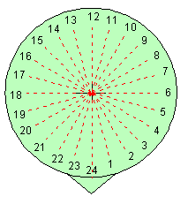 Si prepari adesso un disco dal diametro di circa 8-9 cm. e che riporti da un lato una punta; si divida il disco in 24 settori identici e di ampiezza di 15° ai quali verranno associate le 24 ore della giornata. Le ore 24 o zero andranno segnate in corrispondenza della punta.