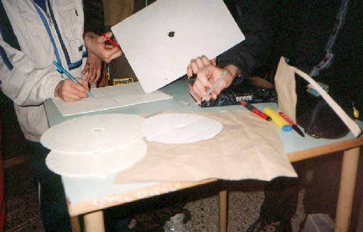 Ci si procuri un pezzettino di tubo di plastica dal diametro di circa 1 cm. e lungo 2 cm. Si pratichi un foro dello stesso diametro su tutti e tre i pezzi in corrispondenza del centro dei dischi e li si fissino assieme incastrando il tubo nei fori nel seguente ordine: disco calendario, disco orario, alidada in modo da ottenere un oggetto come in Fig. 7.