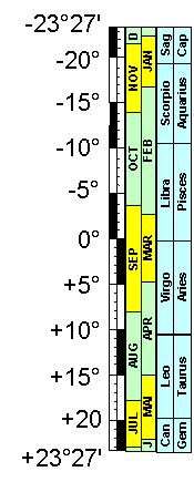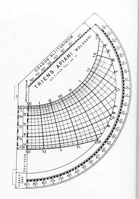 Per facilitare l’individuazione del periodo stagionale nel reticolo venivano riportate scale mensili o zodiacali come quelle qui a fianco.Spesso erano associati anche i valori numerici della declinazione del Sole e che potevano essere utilizzati per il calcolo della latitudine con il metodo dell‘altezza meridiana (come abbiamo già visto). Talvolta, anzi molto spesso direi, sul filo a piombo era praticato un piccolo nodo; prima di effettuare la lettura dell’ora lo strumento veniva regolato sulla data attuale. Il quadrante veniva ruotato in modo da portare il filo a piombo sulle scale delle date e il filo veniva fatto scorrere in modo da far coincidere il nodo con la data, quindi veniva bloccato. In tale maniera, qualunque fosse l’inclinazione dello strumento era il nodo deputato a materializzare la scala della data ed era la sua posizione rispetto alle linee orarie che forniva l’ora solare.